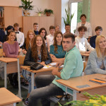 Ģimnāzijā Zinību diena sākās ar klases stundām, kurās virmoja satikšanās prieks, nākotnes sapņu paušana un cerība, ka viss būs labi. Katra klase izdomāja savu šī gada moto un iepazīstināja ar to pārējos līnijā. Klātesošos ar saviem priekšnesumiem iepriecināja Patriks Patmalnieks (7.D), Viktorija Isajeva (10.D) un Sabīne Vaivode (12.D). Zinību dienas līniju vadīja Zane Koņečnija (12.D) un Raivis Luriņš (12.D).